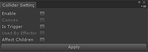 - Affect Children – Enable or disable the properties of the colliders of the childs from the selected gameobject.